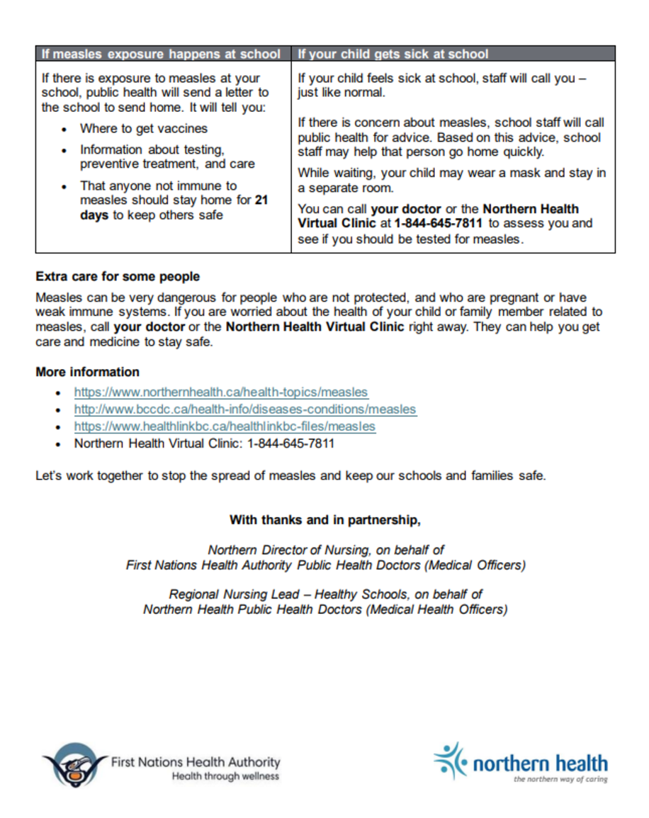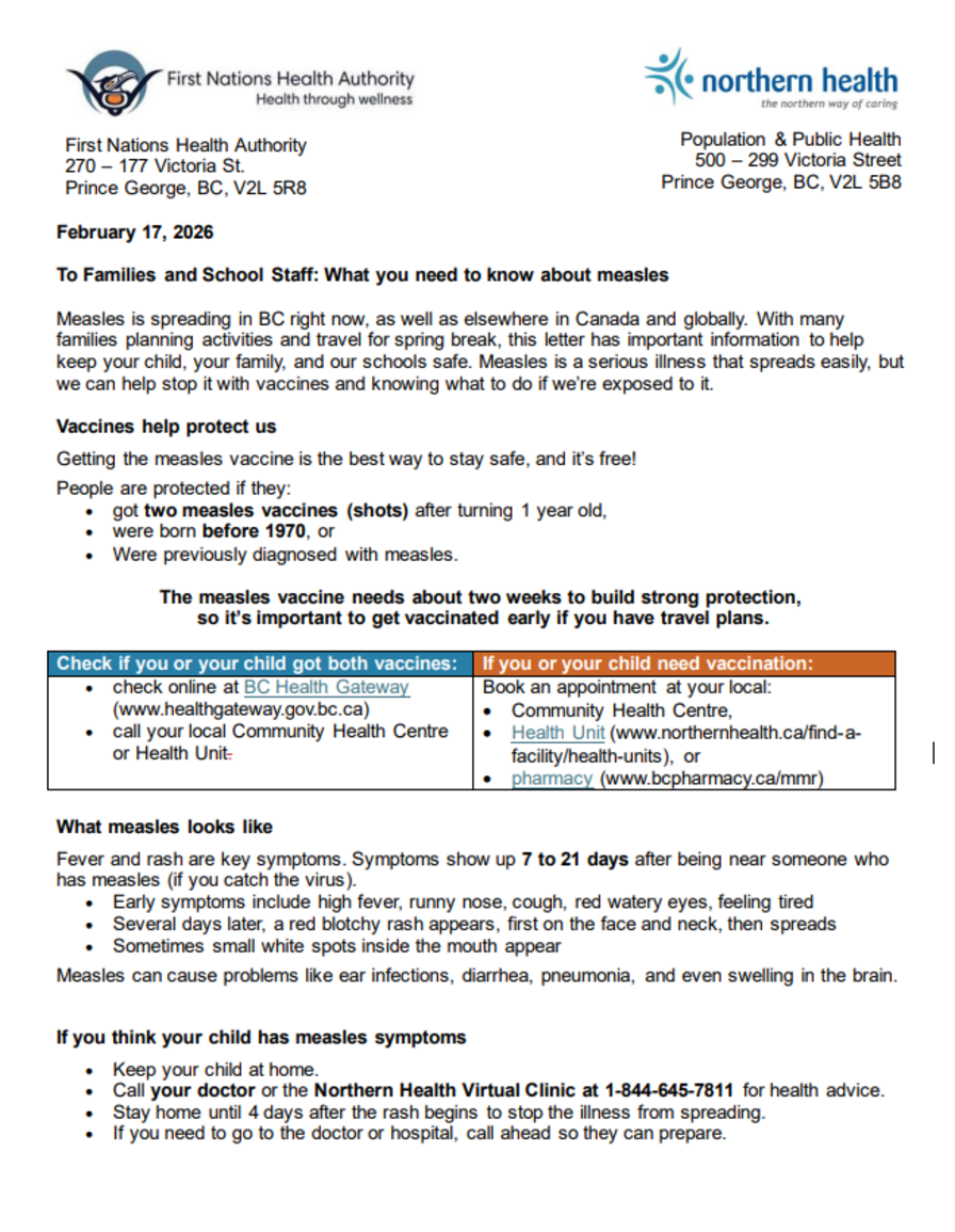 Breadcrumb Home Announcements announcement Northern Health Measles Info Posted: February 19, 2026 - 11:44am Expires: March 13, 2026 - 3:00pm