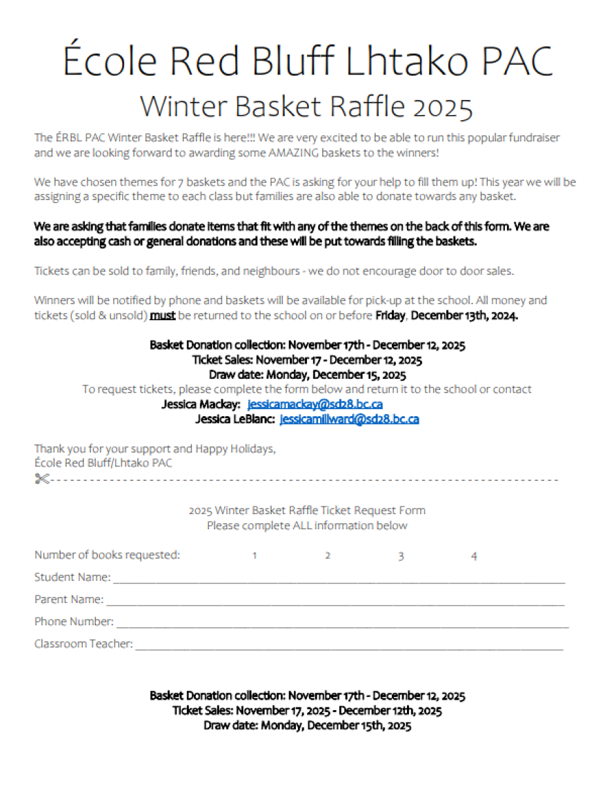 Please see the attached form to request Raffle Tickets and get all the details on Basket Donation collection, Ticket sales and the Draw Date.