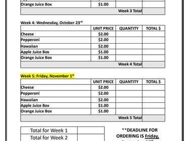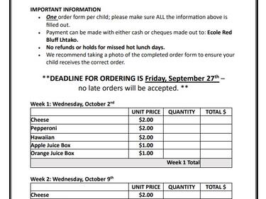Orders are due by Friday, September 27th. Please ensure you have sent the correct amount. There are no refunds for missed hot lunch days.