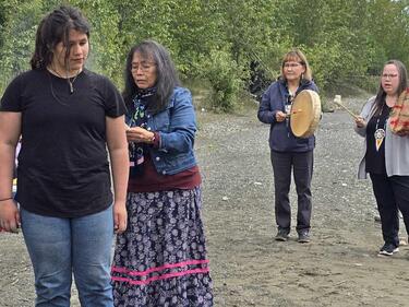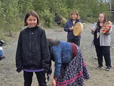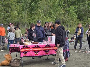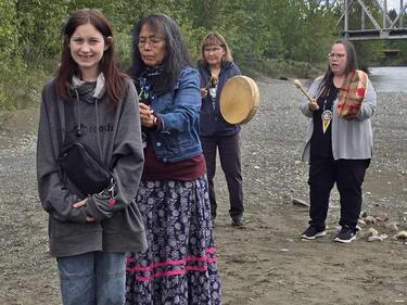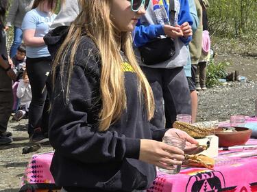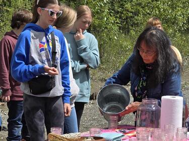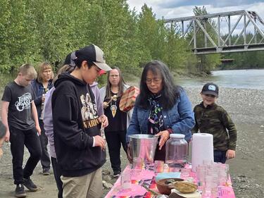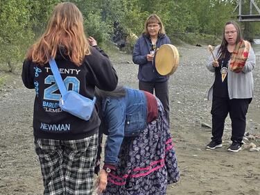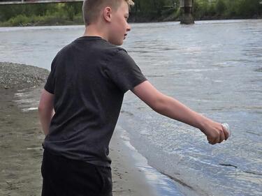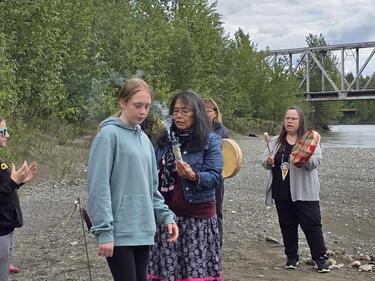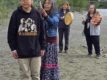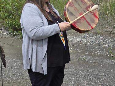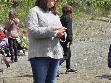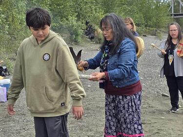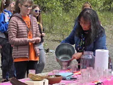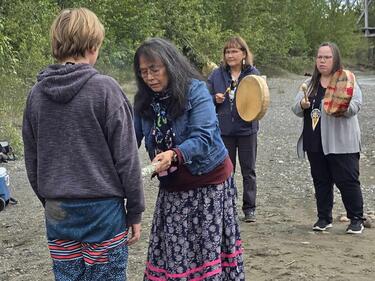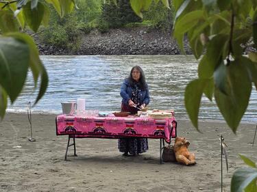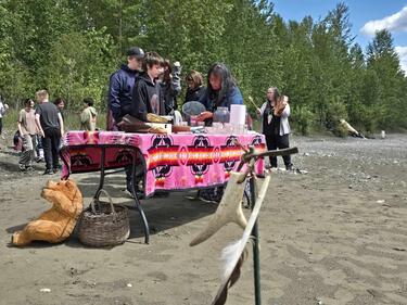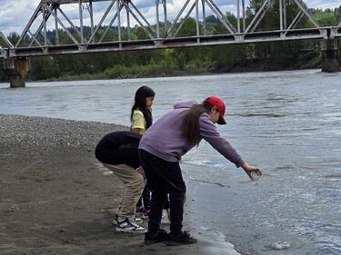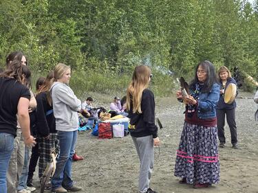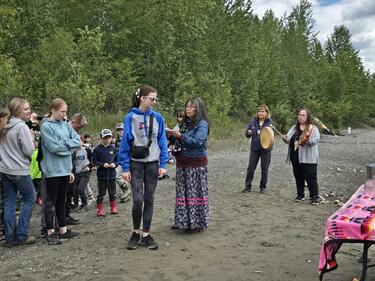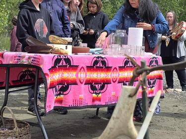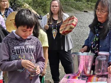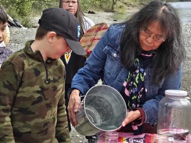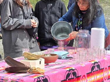 "I invited my auntie Alice William to come and do a Water Ceremony for two of our classrooms. She is a protector of water. First nations people do water ceremonies at any time for different protection purposes, blessings and healing. Water is important to us humans, animals, plants and to Mother Earth. Water is life and we must do our best to protect it. The children brought an organic offering to the river as a gift while they poured their water into the river, and when they did that, they thanked the water, by saying some of these things, you give us life, you help the animals, you help our plants grow, these are some example of what the children were thankful for. The organic gifts the children brought for the river, were leaves, rocks and sticks, all natural things from our earth. This is culture and culture is inclusion."