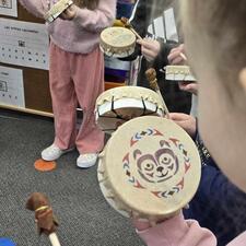 The class set of mini-drums were made locally by Danielle Smith from ?Esdilagh.