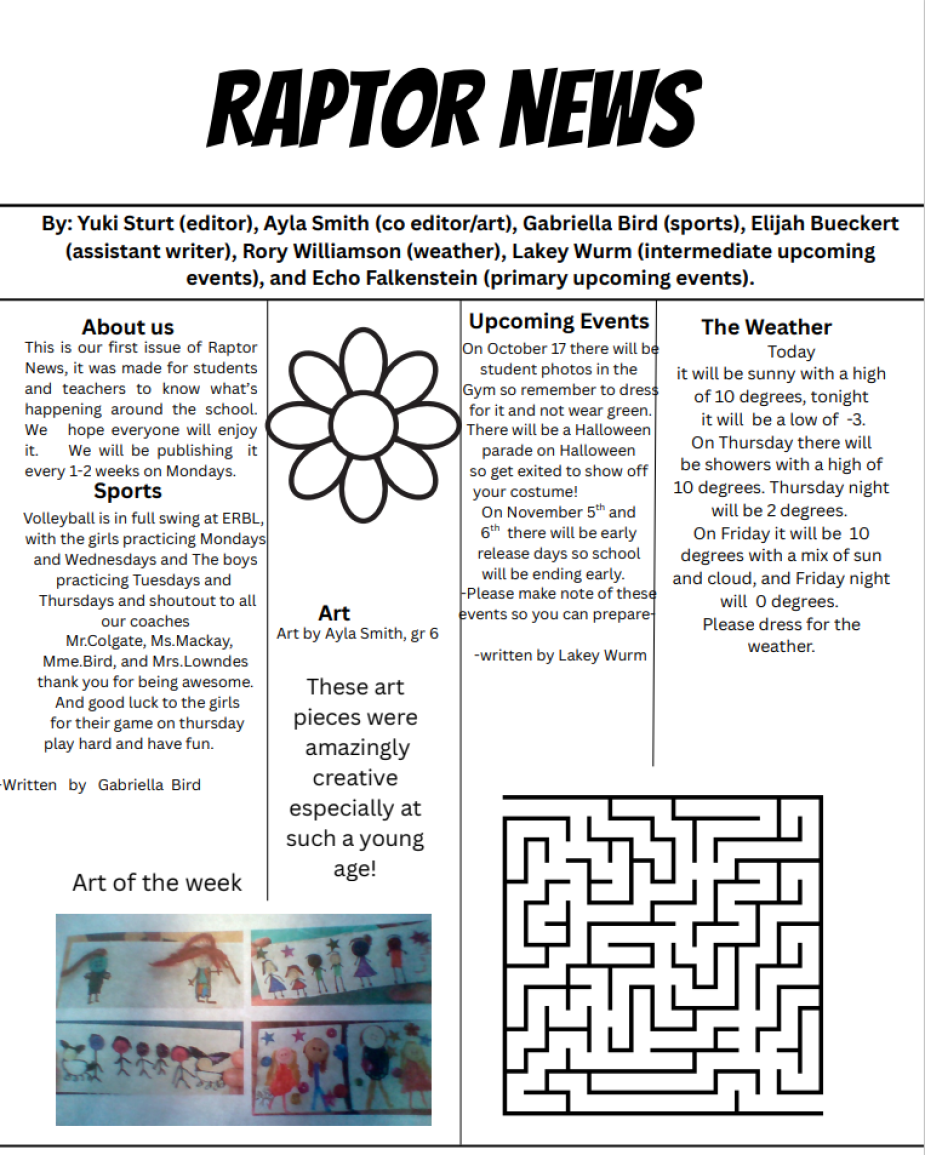 RAPTOR NEWS now has its own page on our school website. In the menu options along the top of the ERBL main page, you'll see RAPTOR NEWS. Just click and it will take you to the Raptor News page with all their newsletters and more!