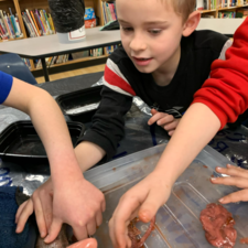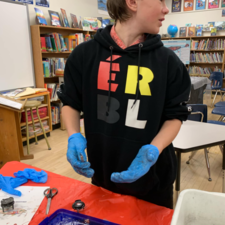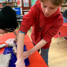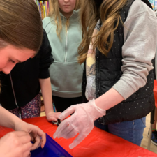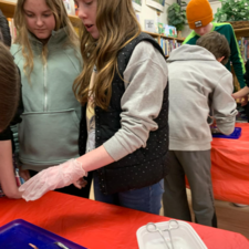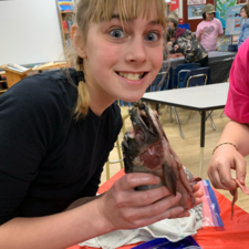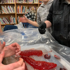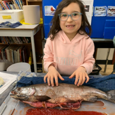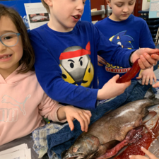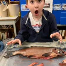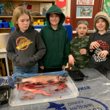 Students learned all about the internal and external anatomy of the salmon, both through a guided dissection, and through hands-on examination of various parts, such as eggs, scales, heart, gills, eyes (including the lenses!), etc.